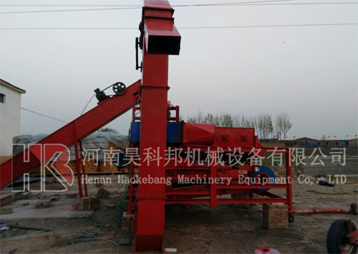該機由機架、上料機、提升機、電動機、齒輥、進料斗、滾筒、風機、地輪等部分組成。